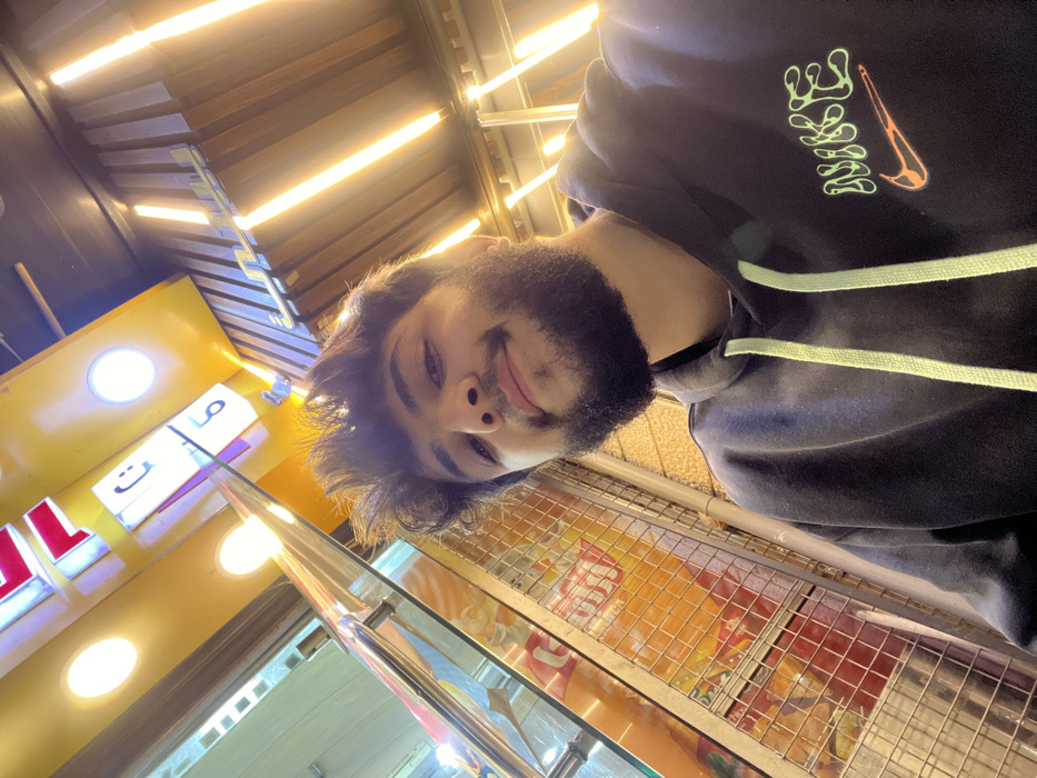 A bearded man in a Nike hoodie smiles for a selfie inside a shop. Fluorescent lights illuminate the wooden ceiling. Behind him, a yellow sign displays Arabic lettering. A metal rack filled with chips is visible in the lower portion of the frame.