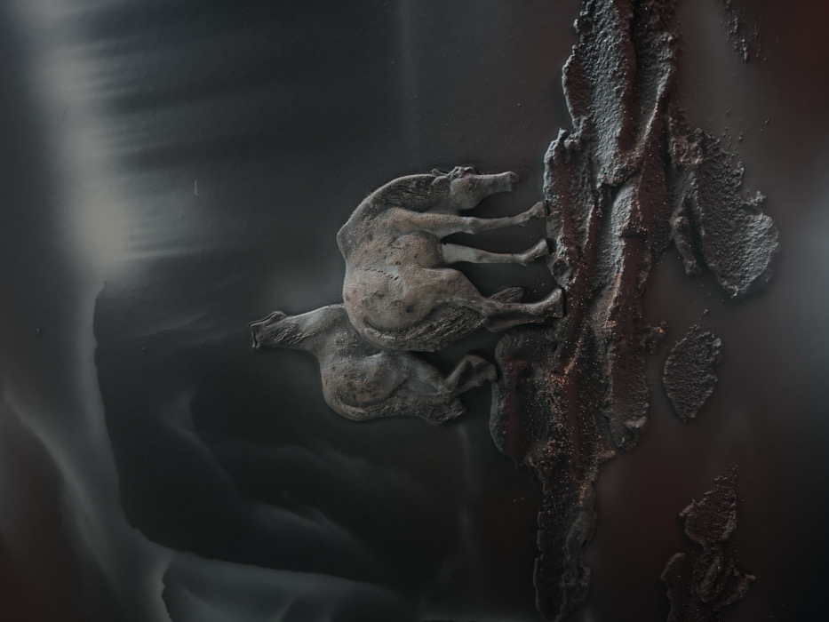 The image showcases two stylized, rough-textured animal figures resembling boars or horses clinging to a craggy, dark vertical formation. The creatures are stacked atop one another, their legs seemingly grasping the textured surface. The background is a dark, smoky expanse, with lighter, flowing patterns suggesting movement or depth. The overall composition has a surreal, sculptural quality.