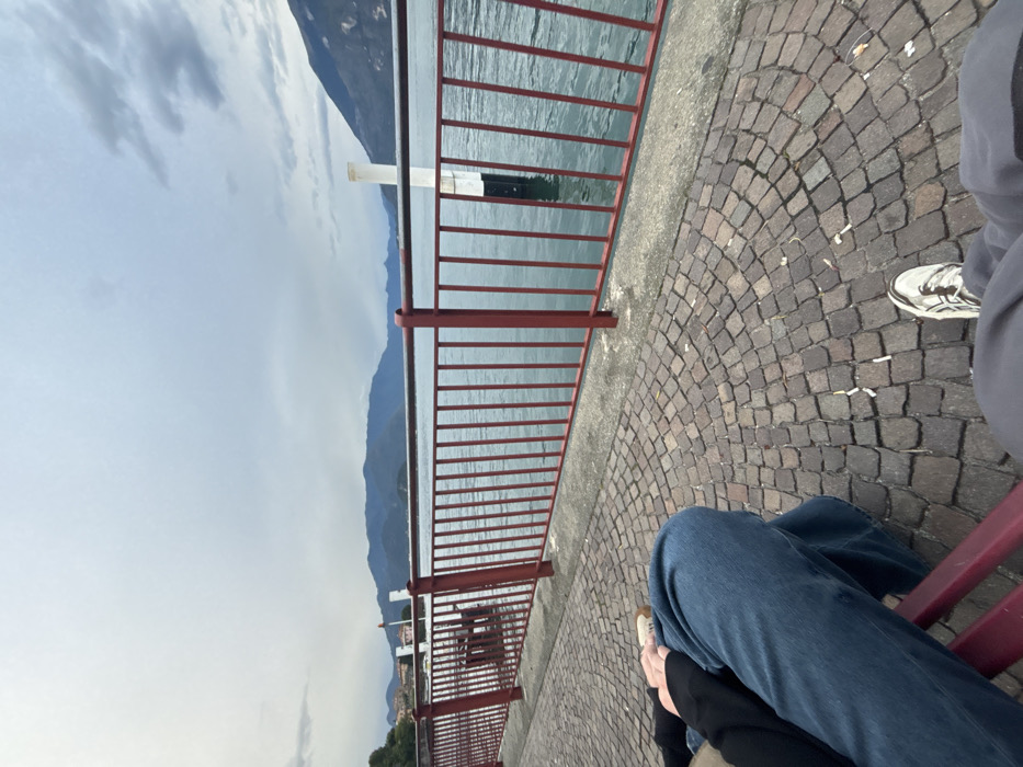 This image depicts a lakeside promenade in Varenna, Italy, under an overcast sky. In the immediate foreground, the lower extremities of two seated individuals are visible. On the left, one person wears blue jeans, with hands clasped over their lap, seated on a reddish-brown bench. To the right, another person wears grey trousers and white athletic shoes. The ground is paved with dark, rounded cobblestones arranged in fan-like patterns, with scattered light-colored debris. A dark red metal railing, mounted on a concrete ledge, spans the midground, separating the walkway from the calm, dark blue-green waters of Lake Como. A white cylindrical mooring pole with a black base is partially submerged in the water on the right side of the frame. In the background, distant mountains rise from the lake, visible beneath a heavily clouded sky. Structures of a town are discernible along the left shoreline.