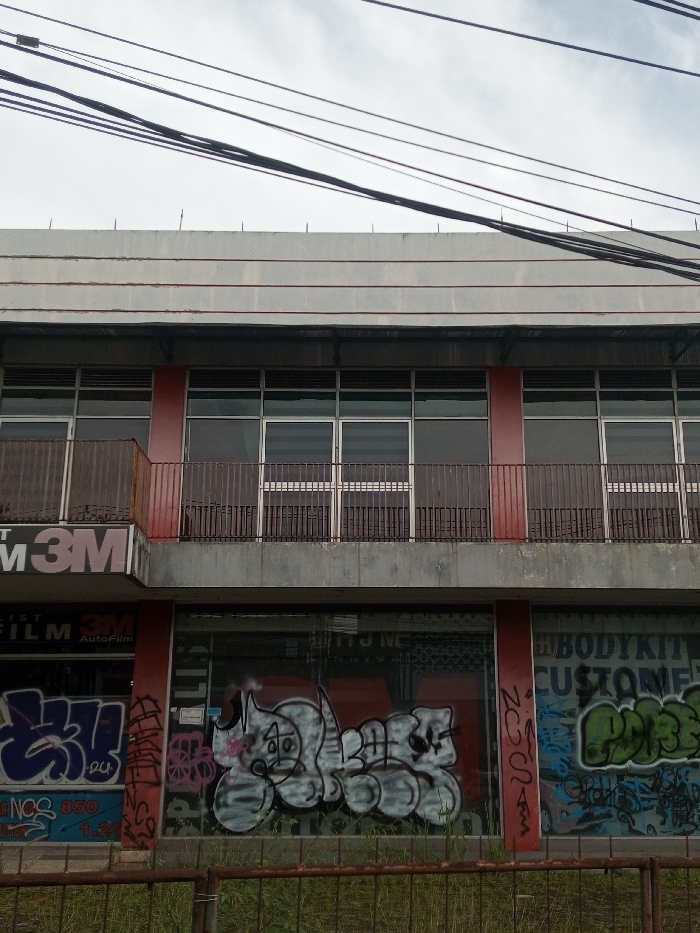 A two-story building shows signs of neglect. The second story has windows with railings, with red dividing columns. The ground floor windows are covered in graffiti art. Storefronts include "3M," "Autofilm," and "Bodykit Custome." Overhead power lines are visible against a gray sky. A rusty fence and overgrown grass line the front, contributing to the building's run-down aesthetic.