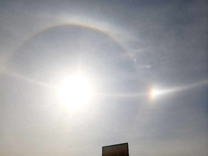 The image depicts a bright sky over the city of New Stadium, Nigeria. A brilliant sun, located in the lower-middle left, emits strong light, dominating the scene. Surrounding the sun is a distinct, circular solar halo, displaying faint rainbow colors. To the right of the sun, a prominent parhelion (sundog) appears as an intensely bright, iridescent spot with a horizontal light streak extending to the right. The sky exhibits varying shades of light blue and hazy white. In the bottom-center foreground, the upper edge of a dark, rectangular structure, possibly a sign or building component, is partially visible. No people are present in the image.