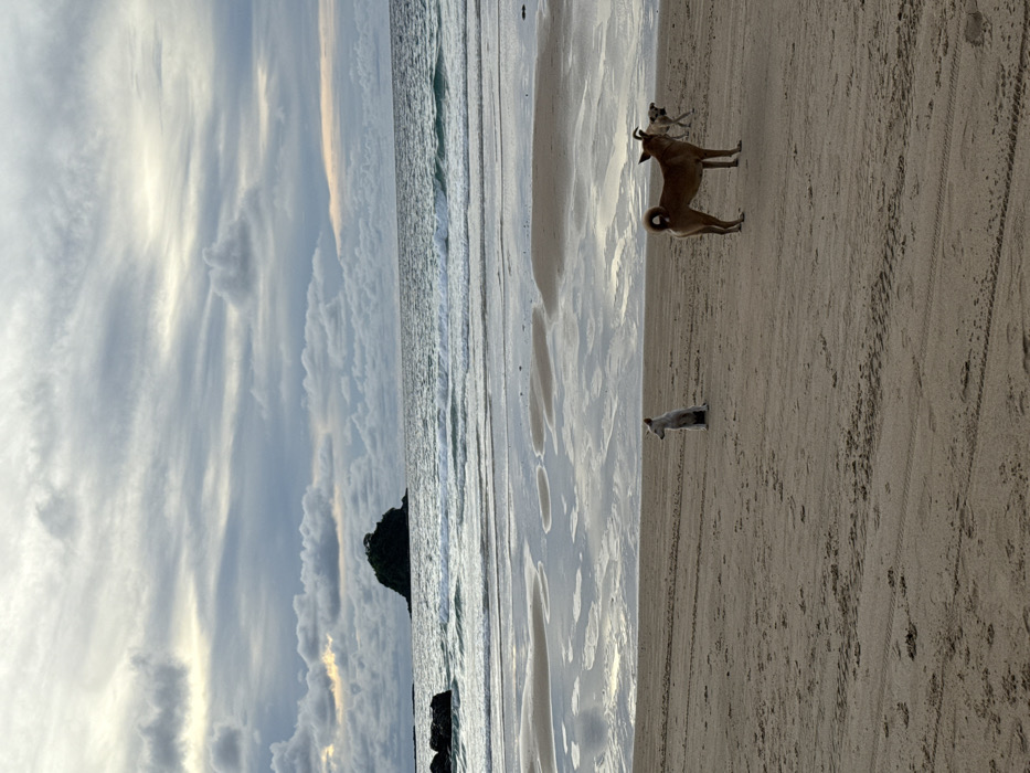 The image depicts a beach scene in El Nido, Philippines, under an overcast sky with dense grey stratocumulus clouds. The foreground consists of damp, light brown sand marked with tire tracks and footprints. The midground features the ocean with moderate waves breaking towards the shore, reflecting the muted sky. In the distant ocean, a small, conical, heavily vegetated island is visible, and to the left, several dark rock formations are partially submerged near the water's edge. Three dogs are present on the sandy beach. To the left, a light-colored dog is seated, facing left, with its back slightly angled towards the viewer. In the center-right, a reddish-brown dog stands facing right, its tail curled upwards over its back. Further to the right and closer to the water, a third, lighter-colored dog is partially visible, moving towards the right. No direct interactions between the dogs are depicted. The overall environment is a natural coastal landscape.