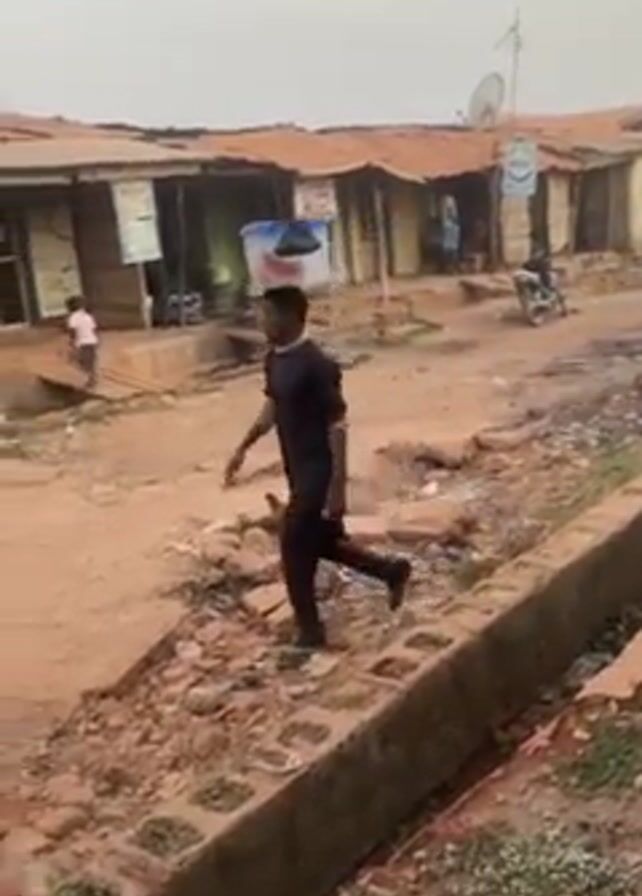 man walking in a dirt-covered urban area, carrying a blue container of cut watermelons on his head. He's wearing a black long-sleeved shirt and pants. The environment includes small, dilapidated buildings with corrugated metal roofs. There's a yellow auto-rickshaw, also known as a "keke," parked nearby. Litter is scattered along the ground, and a drainage ditch runs parallel to the street. A few other people can be seen in the background.