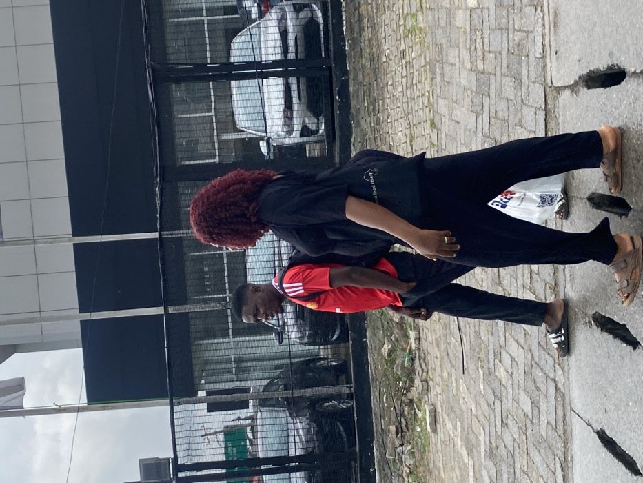 Two individuals are depicted walking on a paved sidewalk alongside a street in a city, identified as Itirin, Nigeria