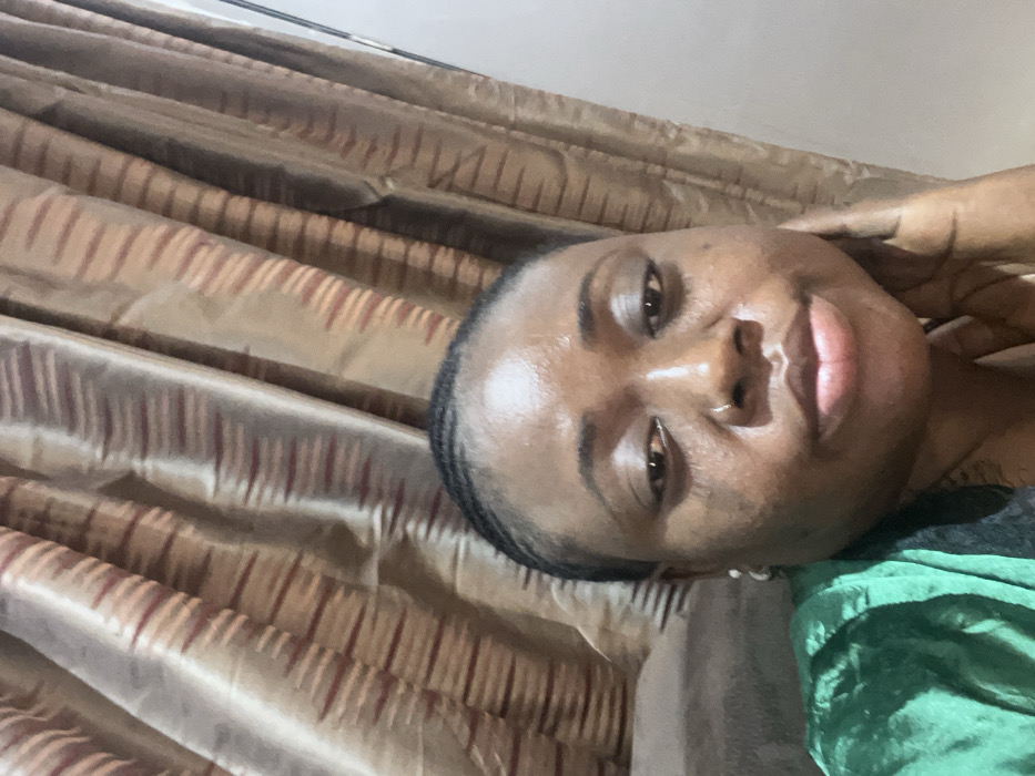 A person with dark skin and short black hair faces the camera. She is slightly tilted, with her hand gently touching her face near the ear. The background features striped, brown and gold fabric. The person seems relaxed with a soft expression, and a small nose ring is visible. The lighting highlights the texture of her skin.