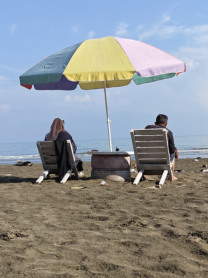 - "On a beach in Reudeuep, Indonesia, two individuals are seated in light-colored wooden slatted chairs facing the ocean under a multi-colored beach umbrella" by FM-he8AW2, licensed under CC BY 4.0