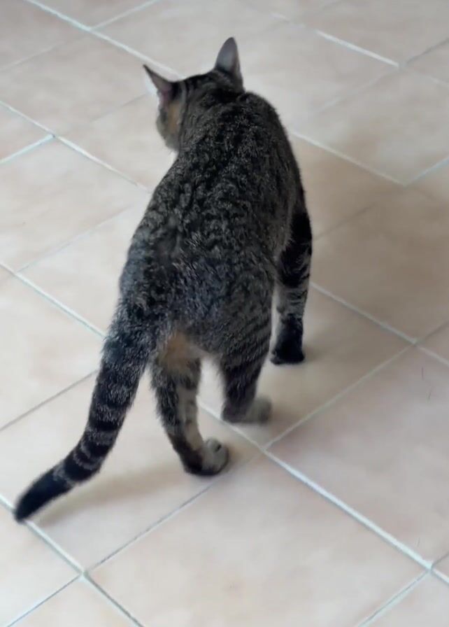 A brown tabby cat is shown on a tiled floor