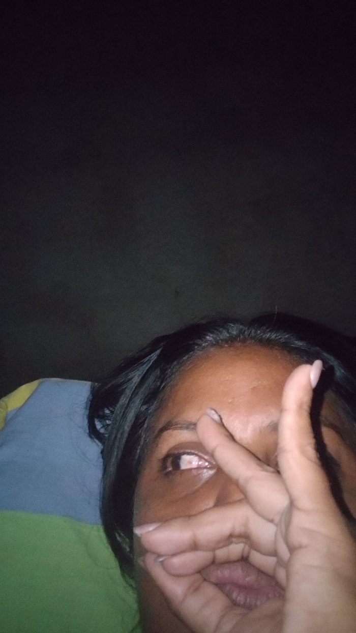 A selfie-style close-up shows a person lying on a pillow, partially obscuring their face with their hand. The person is looking up, away from the camera. The lighting is dim. They have dark hair and skin. One eye is visible and appears irritated or bloodshot. The pillow is multi-colored, and the background is dark.