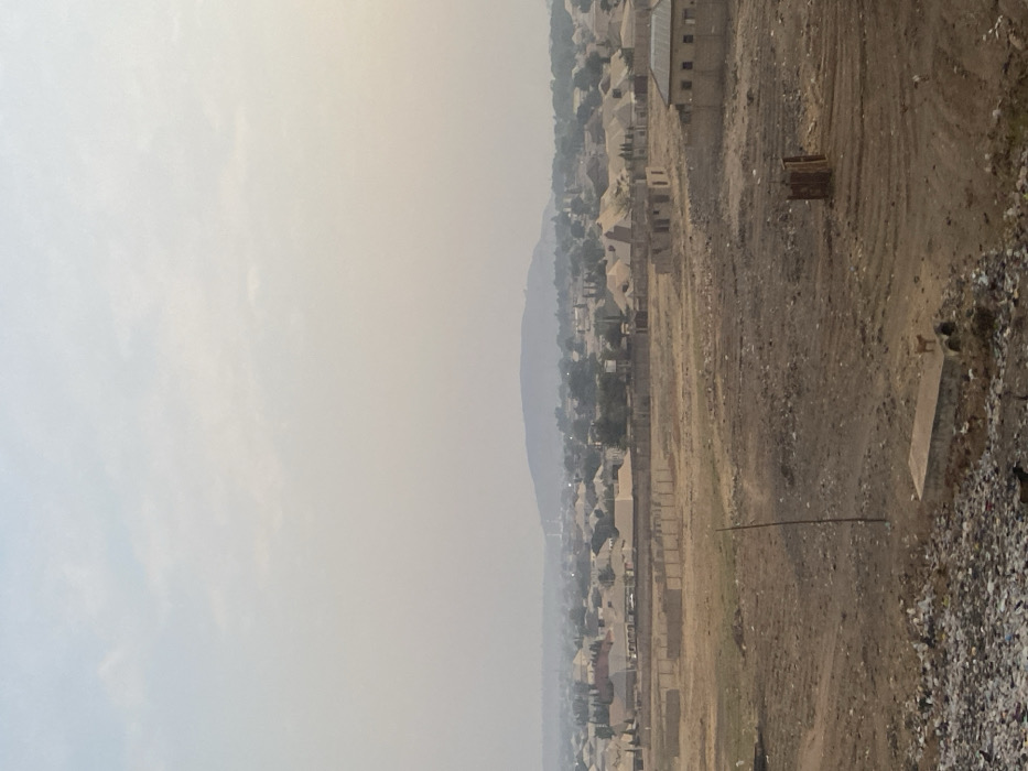A hazy view shows a landscape divided between a pale sky and earth. Buildings are concentrated in the middle, blending with the terrain. A mountain rises in the background. In the foreground, a gravelly, uneven surface extends to the lower edge. A concrete structure is visible on the right. A set of wooden planks sits in the middle.