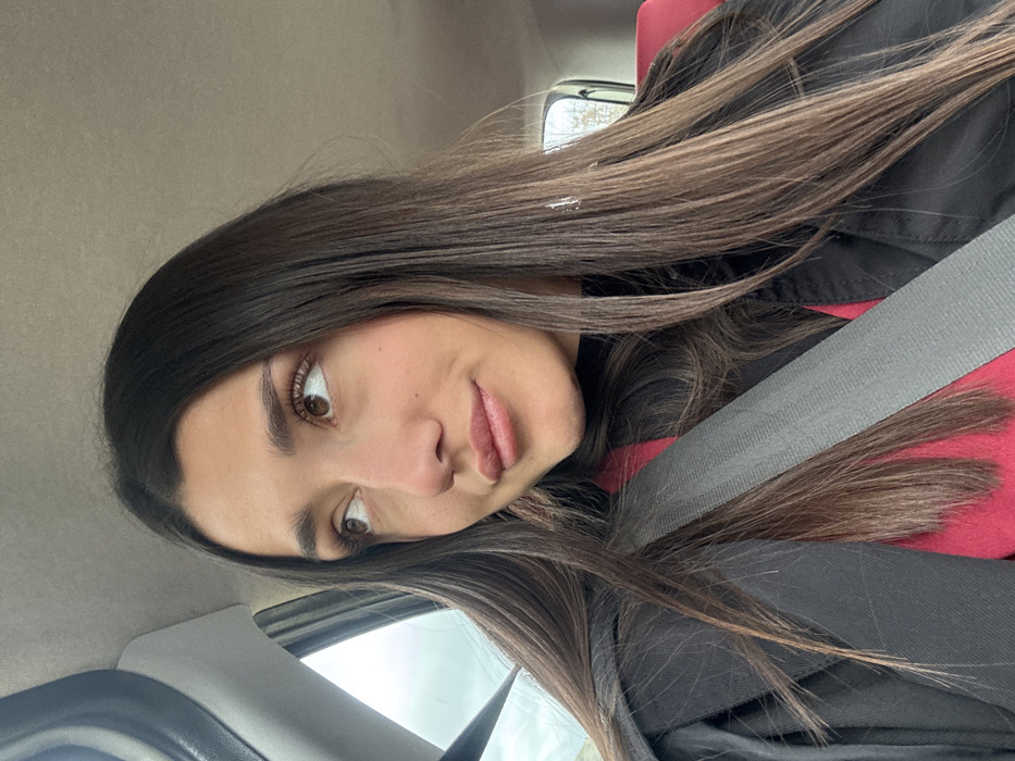 A medium close-up portrait features a female individual seated inside a vehicle. The subject has long, dark brown hair with lighter brown highlights, parted on the left side, and light brown eyes. Her complexion is fair, and she displays a slight smirk while looking upwards and to her left. She is dressed in a black collared garment over a fuchsia-colored underlayer, secured by a grey vehicle seatbelt diagonally across her chest and right shoulder. The vehicle's interior is visible in the background, including a light-colored ceiling and parts of the car windows. Through the windows, an overcast sky is visible on the left, and green foliage outside the rear window on the right. The specific location within the city of Kaluđerac, Montenegro, is not discernible from the visual evidence.