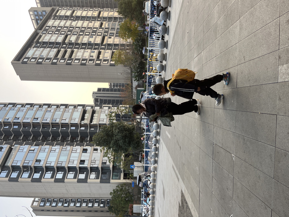 The image depicts an urban street scene in Wenjiang District, China, likely during late afternoon given the soft lighting. In the foreground, a paved pedestrian area with light grey square tiles extends across the frame. Two individuals, an adult female and a young child, walk from left to right. The adult female, positioned centrally, wears a dark puffer jacket, dark pants, and light-colored shoes. She holds a folded, light-colored garment, possibly a jacket, in her hands and looks slightly downward to her left. The child, a young boy, walks a short distance ahead of the woman, carrying a bright yellow backpack. He wears a dark jacket with white stripes on the sleeves, dark pants, and multi-colored sneakers, and is looking slightly to his right. Behind the pedestrians, a row of grey spherical bollards separates the paved area from a section containing numerous parked two-wheeled vehicles, including scooters and electric bikes, some with yellow branding. A white metal railing is visible beyond the bollards. To the far left, a blue street sign with a white pedestrian crossing symbol is present. The background is dominated by several tall, modern multi-story buildings, characterized by grey facades and large, rectangular windows with dark frames, some featuring glass balconies. The sky is a light, hazy grey, and scattered trees with sparse foliage are visible between the buildings and the street level.