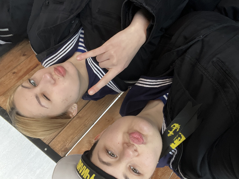 The image depicts two young adult females, likely cadets or personnel of the Bulgarian Navy, posing closely together in what appears to be an indoor setting. The female on the left, positioned closer to the viewer, has short, dark hair and is wearing a light-colored sailor's cap with a black band featuring yellow Cyrillic text, partially legible as "ВМС" (an abbreviation for Bulgarian Naval Forces), and a yellow anchor emblem. She is also wearing a dark blue uniform jacket over a blue and white striped top, with a dark blue sailor collar that features three white horizontal stripes. A black ribbon with yellow anchor motifs hangs from her collar. Her lips are puckered in a "kissing" or "pout" expression. The female on the right has blonde hair and is positioned slightly behind the first. She is wearing a similar dark blue uniform jacket over a blue and white striped top with a dark blue sailor collar featuring three white horizontal stripes. Her left eye is closed in a wink, and her lips are also puckered. Her right hand is raised, performing a "rock on" gesture with the index and pinky fingers extended. She has a small, light-colored stud earring in her left earlobe. The background consists of light-colored, horizontally arranged wooden paneling, possibly part of a wall or a bench, with dark metal fixtures visible at the plank joints. Given the distinct naval uniforms bearing Bulgarian Naval Forces insignia, the scene is located in Varna, Bulgaria, highly likely within the premises of the Naval Academy "N. Y. Vaptsarov" (Висше военноморско училище "Никола Йонков Вапцаров"), which is situated in the city.