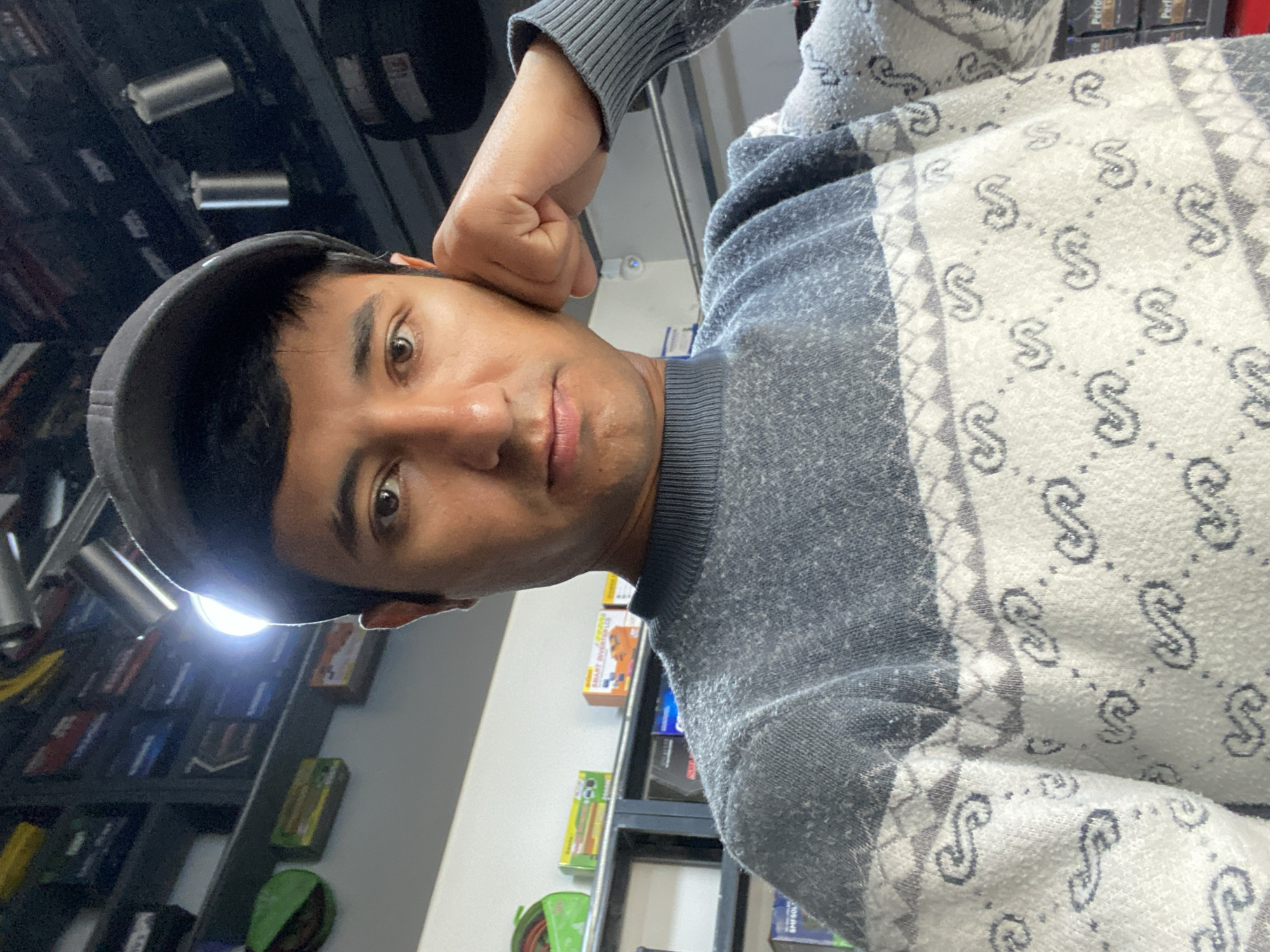 An adult male subject is depicted in a close-up, chest-up portrait shot, positioned within an indoor commercial establishment in Bukhara, Uzbekistan. The subject has an olive complexion, dark hair, and wears a dark grey baseball cap and a grey and white knitted sweater. The sweater features a dark grey mock-neck collar and upper chest, a lighter grey patterned band with geometric motifs, and a white lower section with repeating dark grey scroll-like patterns. His right hand is closed into a fist, supporting his chin/jaw area, with his forearm resting against his chest. His gaze is directed forward, towards the camera. The background reveals metal shelving units, predominantly dark grey or black, stocked with various packaged goods in boxes of different colors (blue, orange, yellow, green). Visible labels include "SMF SOLA" and "SMART INVERTER LED," suggesting electronic components or accessories. A bright, circular light source is positioned behind the subject's head on the left side. A white surveillance camera is mounted on a light-colored wall section, visible over the subject's right shoulder. Additional objects in the background include a green coiled item on a shelf to the left and several cylindrical metallic objects on a shelf to the upper right. The lighting is artificial, illuminating the scene from multiple sources.