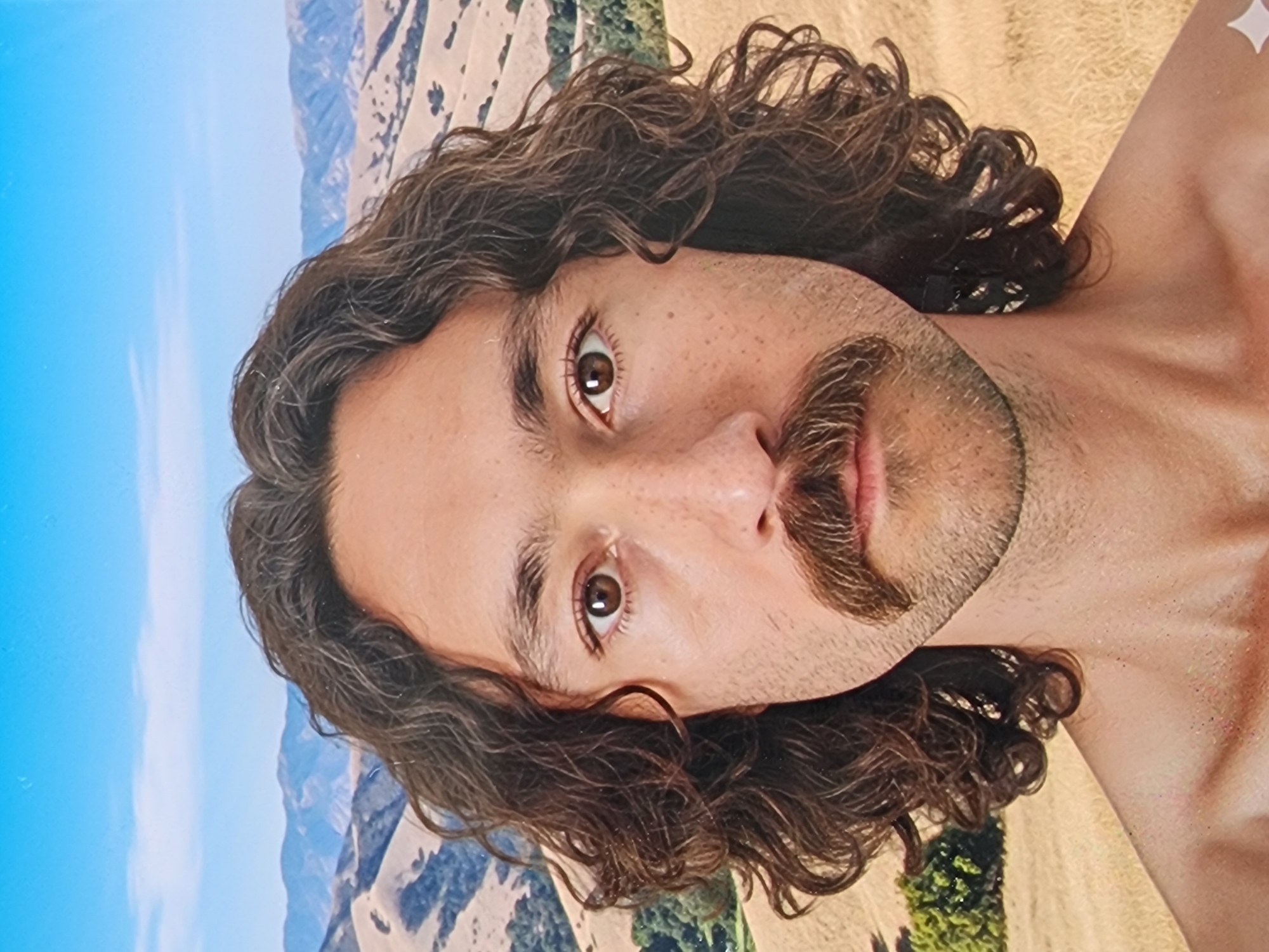 A medium shot depicts a light-skinned individual with brown eyes, curly brown hair, and a mustache. The person's face is the focal point, positioned centrally in the frame. The background consists of a landscape featuring a blue sky, mountains, and what appears to be a field of dry grass or wheat. The location in the city is unknown.
