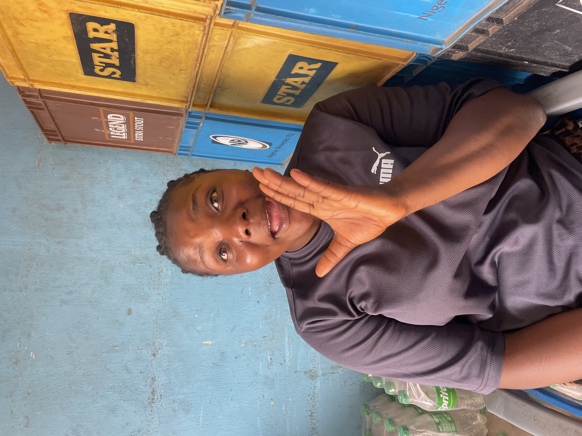 A woman with dark skin, wearing a grey Puma shirt, is positioned in front of stacked crates. The crates feature brands: STAR, LEGEND EXTRA STOUT, and Nigerian Breweries Plc. She is raising her right hand near her face with a playful expression. The background wall is painted blue. Multiple bottles of Sprite are stacked beneath her. The city of Jos, Nigeria is not confirmed from this image.