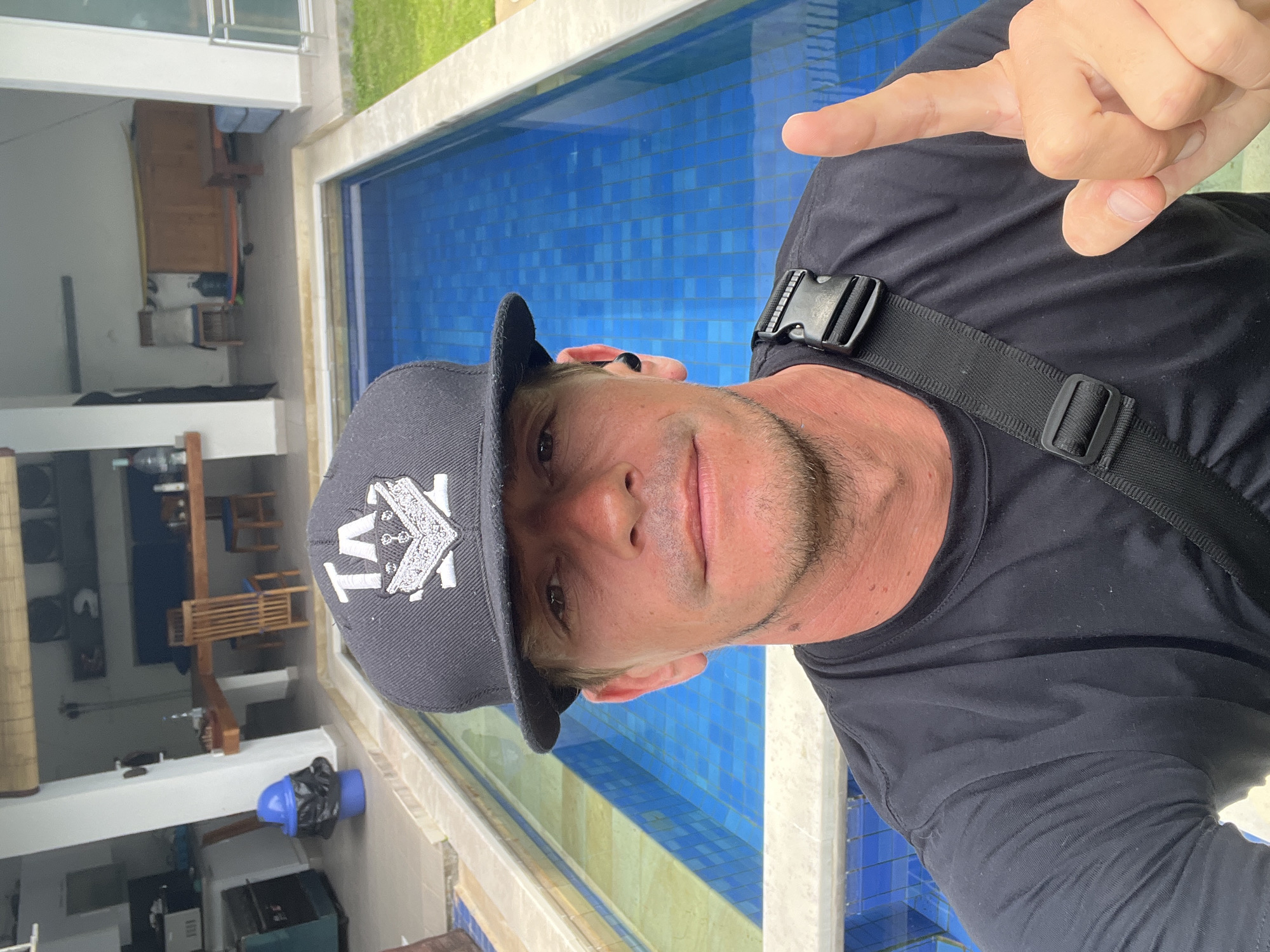 A male individual is captured in a mid-shot selfie, positioned outdoors in Pecatu, Indonesia. He has light skin, light stubble on his face, and wears a black t-shirt and a black baseball cap featuring a white "TA" logo with additional intricate designs. A black earbud is visible in his right ear. A black strap, consistent with a messenger bag or sling bag, crosses his right shoulder. His right hand is raised, with the index finger extended upwards. Behind the subject is a rectangular swimming pool with blue and lighter blue tiled walls and floor. Beyond the pool, an open-sided covered patio structure is visible. On the left side of the patio, a kitchen area features white cabinetry, a microwave, and a blue trash receptacle. In the center, a wooden dining table is set with wooden chairs, some equipped with blue cushions. A glass bottle rests on the table. Further to the right within the patio, additional furniture, including a wooden console and a large water dispenser bottle on a low trolley, are present. Green grass is visible on the far right edge of the frame, bordering the pool. The scene is brightly illuminated by natural light.