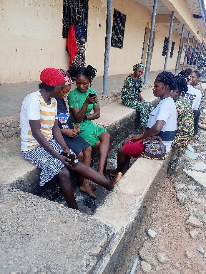 This image captures an outdoor scene in Akwanga, Nigeria, showing a group of young women gathered in front of a building