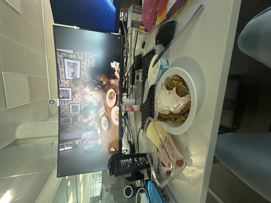 An eye-level shot captures a white office desk in Heimertingen, Germany, featuring a prepared meal and computer monitors
