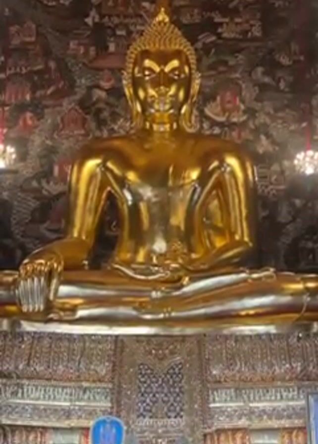 golden Buddha statue in a seated position inside a temple. The statue is the focal point, elevated above a highly decorated altar. Behind the statue, there is a mural depicting scenes of daily life. Chandeliers hang from the ceiling.