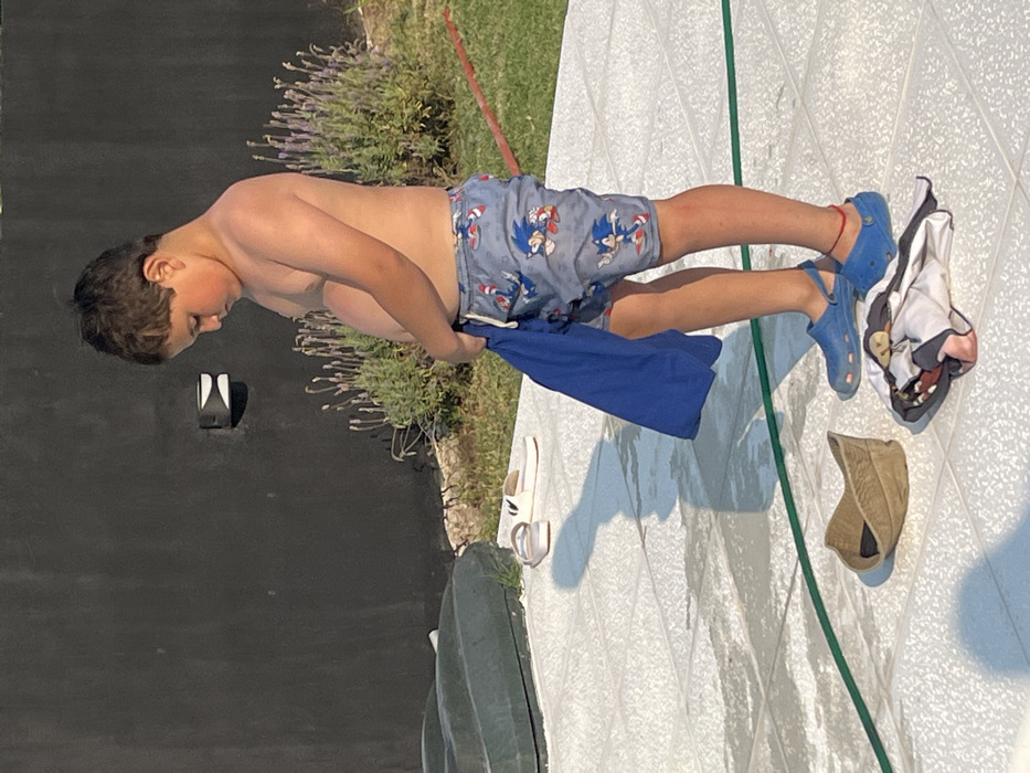 A young boy in Sonic-themed swim trunks stands outdoors, possibly near a pool. He holds a blue cloth or towel. The boy is wearing blue Crocs. Various items, including a white sneaker, a child's towel, and a hat, are scattered on a textured surface. A dark fence and greenery are in the background. The image is rotated.