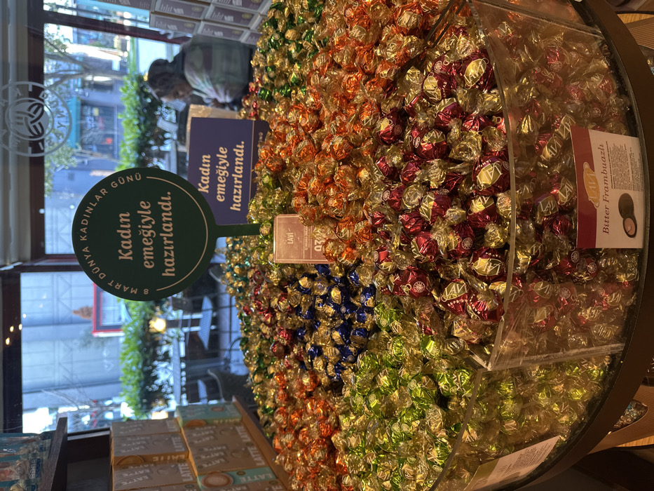 A circular display case overflows with colorful foil-wrapped chocolates. Segments of green, orange, blue, and red candies are visible. A green, circular sign reads "8 MART DÜNYA KADIN" and "Kadın emeğiyle hazırlandı". Adjacent to it is a rectangular sign with the same text. A "LAVI" label is displayed. Another sign advertises "Bitter Frambuazlı" chocolates. Boxes labeled "LATTE" are stacked below. A person is visible through the window's reflection.