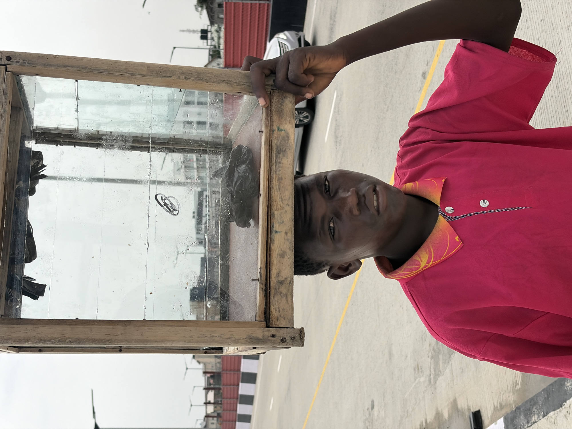 A man stands on an asphalt road in Igboefon, Nigeria. He is holding a multi-paned glass window frame, which reflects the surrounding buildings and sky. He is wearing a red collared shirt. A white vehicle is parked in the background. Buildings are visible in the distance, and a red and white barrier lines the road.