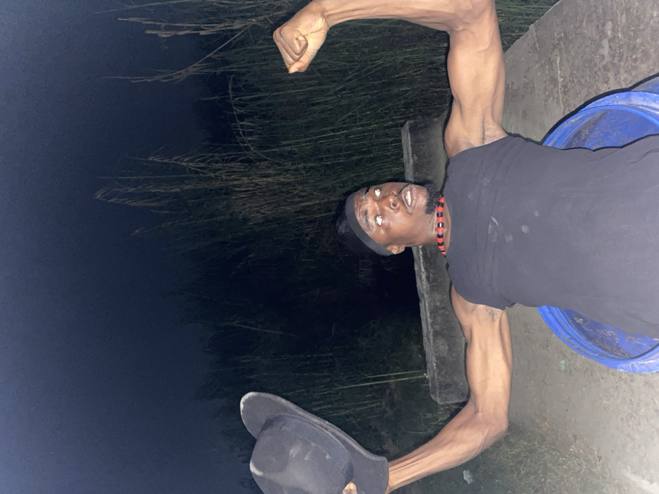 A man with a black bandana poses outdoors at night, facing upward. He wears a black shirt and a red and black beaded necklace. His muscular arms are flexed; one hand is balled into a fist, and the other holds a black hat. He stands near a blue bucket and a concrete edge. Tall grasses are visible in the background. The lighting is dim, creating a somewhat mysterious atmosphere.