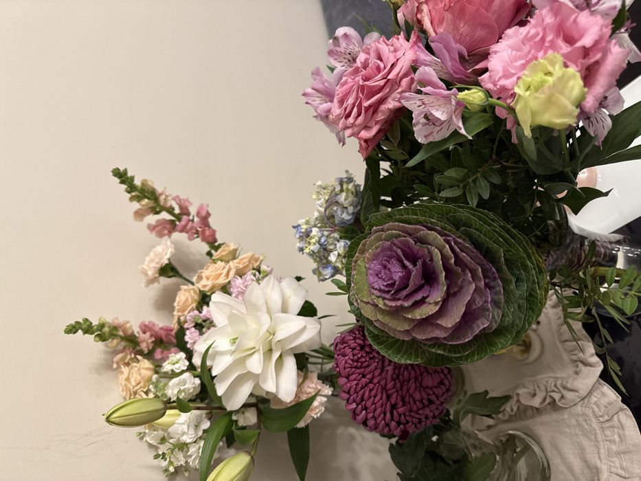 The image displays an indoor still life arrangement consisting of multiple bouquets of flowers. No people are visible. The flowers are placed on a dark, reflective surface, possibly a table, with a light-colored, ruffled fabric element visible on the left. The background is a plain, light beige wall. In the upper left quadrant, a bouquet is visible containing white double lilies, white stock flowers, light peach/pink spray roses, and green lily buds. In the lower central area, another bouquet features a large ornamental cabbage (or kale) with green and purple-magenta leaves, a dense, spherical deep magenta chrysanthemum, and hints of blue hydrangea flowers further back. In the lower right quadrant, a third bouquet contains multiple pink roses, pink alstroemeria, and a light green-yellow flower bud. Several glass vases are partially visible, holding the flower arrangements. The specific location within the city of Moscow, Russia, cannot be determined from the visual information provided in this image.