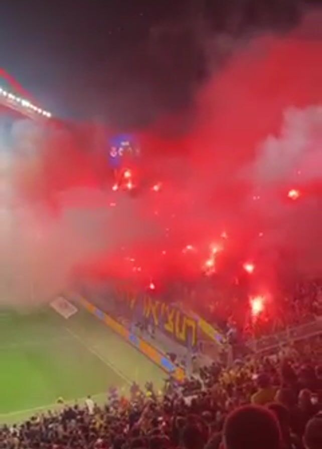At night, a video shows a soccer stadium filled with fans. On one side of the field, a dense cloud of red smoke hangs in the air as fans hold up lit red flares. The green field is visible with players wearing red and yellow uniforms. The stadium lights illuminate the scene. Banners are visible among the fans.