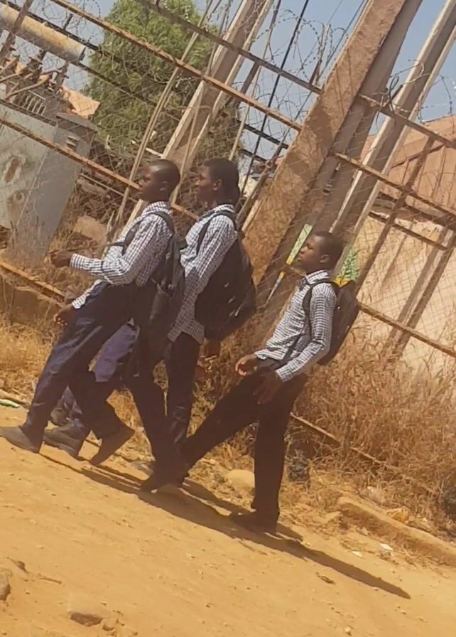 Three young men in similar clothing, checkered shirts and dark pants, are walking in single file along a dirt path. Each carries a backpack. To their left is a metal fence topped with barbed wire. Beyond the fence is a structure that appears to be a power transmission tower. The path is edged with dried grass and other vegetation. The scene is brightly lit, suggesting daylight. The last shot shows what seems to be a car that has been stripped of paint. There is also what appears to be a small roadside shop.