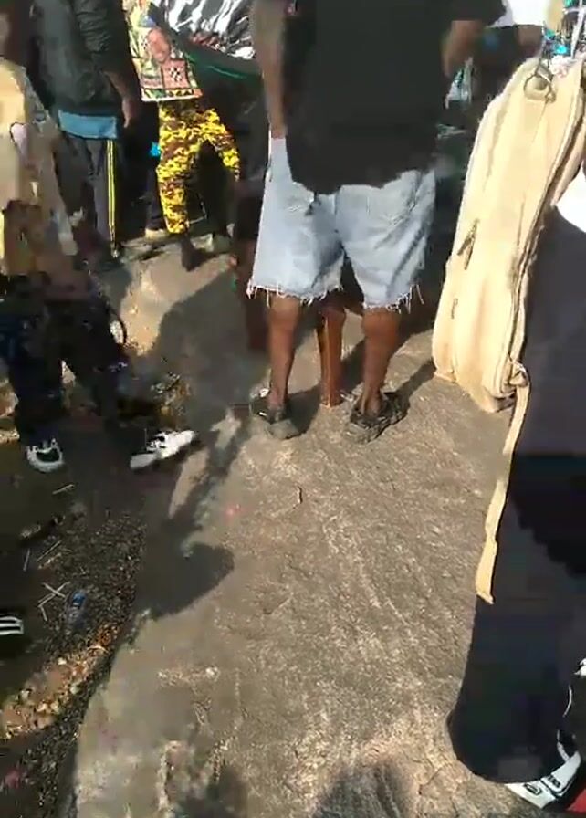 gathering of people in an outdoor setting. The ground is a concrete surface, possibly a walkway. There is litter scattered on the ground. The video is shot from the perspective of someone standing in the crowd, focusing on the backs of several individuals. People are dressed in a variety of casual clothing, including shorts, t-shirts, hats, and sandals. One person has a light brown satchel bag over their shoulder. There are small vendors selling refreshments in the background. The overall impression is of a casual, crowded event.