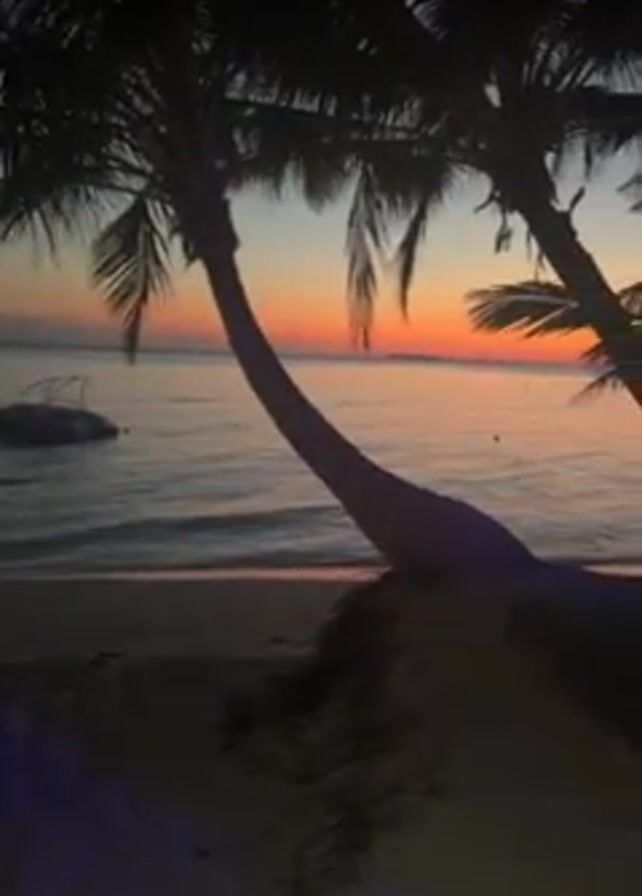 beach scene at sunset. Two palm trees are silhouetted in the foreground, framing the view of the ocean. The sky is colored in shades of orange and red. The water is calm and reflects the colors of the sky. A small boat is visible in the distance. The sand on the beach is light-colored.