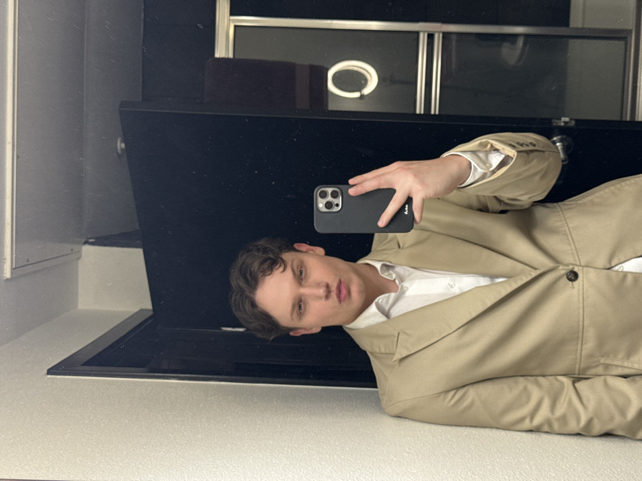 A young adult male, appearing in his late teens or early twenties, is depicted in a mirror selfie, captured from the waist up. He has fair skin, dark wavy hair styled with a center part, and is looking directly at the camera with slightly pursed lips. He wears a beige single-breasted blazer over a white collared shirt, with the top button of the shirt undone. His right hand holds a dark-colored smartphone (likely an iPhone 14 Pro or 15 Pro) with a dark case, positioned to capture the reflection. His left arm and shoulder are pressed against an off-white, textured wall. The background reflected in the mirror behind him shows a dark interior, possibly a restroom or changing area, with a dark partition or door to the immediate right of his reflection. Further right in the reflection, a metallic-framed enclosure, potentially a shower or stall, is visible, containing a circular illuminated fixture. The reflected ceiling above is a standard white panel drop ceiling. The specific location within the city of Los Angeles, United States of America, cannot be ascertained from the visual evidence provided in the image.
