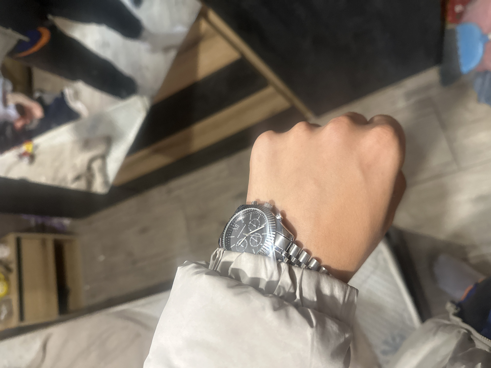 A first-person perspective image shows a person's wrist wearing a silver wristwatch with a black face, partially covered by the sleeve of a light-colored jacket or coat. The watch has subdials and Roman numerals on the face. The background is blurry, but it appears to be an indoor setting. Reflections of objects and people can be seen in what looks like a glass surface to the left. In the top right corner, what seems to be colored toys or clothing are present. The flooring appears to be wood-look laminate. There is no information to support the location of this image.