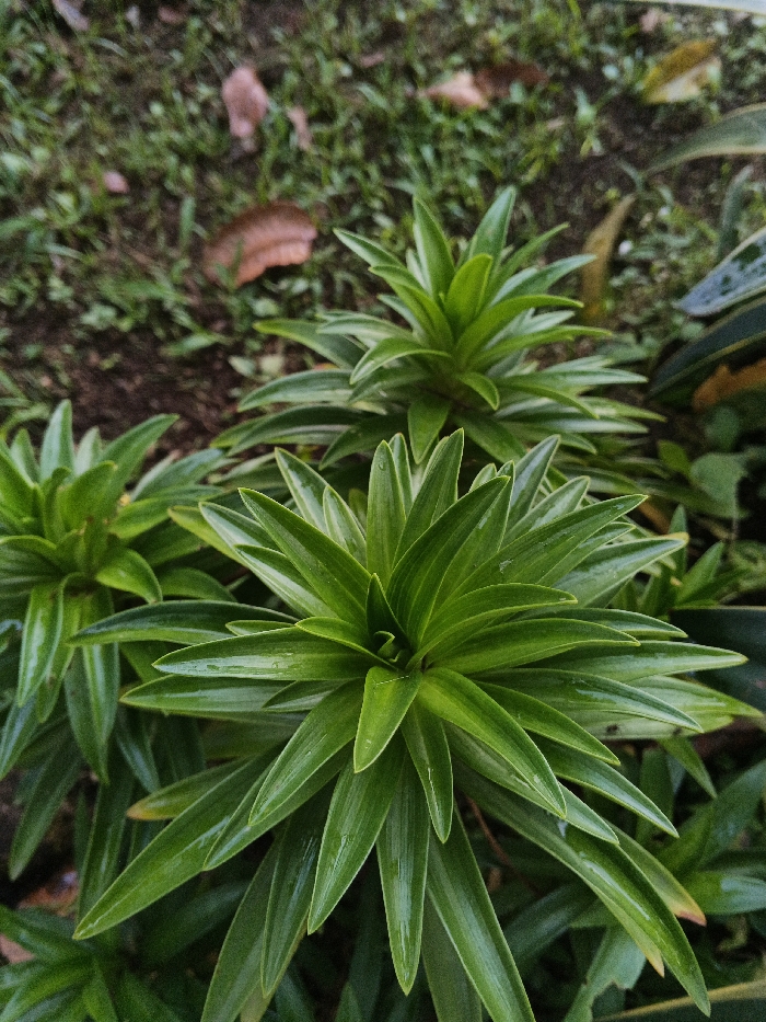 The scene, located in São Félix do Xingu, Brazil, presents a close-up, downward-angled view of a group of herbaceous plants. The foreground is dominated by three vibrant green plants, each displaying a dense rosette of elongated, lanceolate leaves radiating from a central point. The leaves exhibit a glossy texture and visible surface moisture, suggesting recent precipitation or dew. The central plant is in sharp focus, with lighter green new growth at its core. Other similar plants are visible in the midground, slightly out of focus. The background consists of blurred dark brown soil and sparse green grass, interspersed with several dry, reddish-brown fallen leaves. No human subjects or discernible actions are present within the frame.