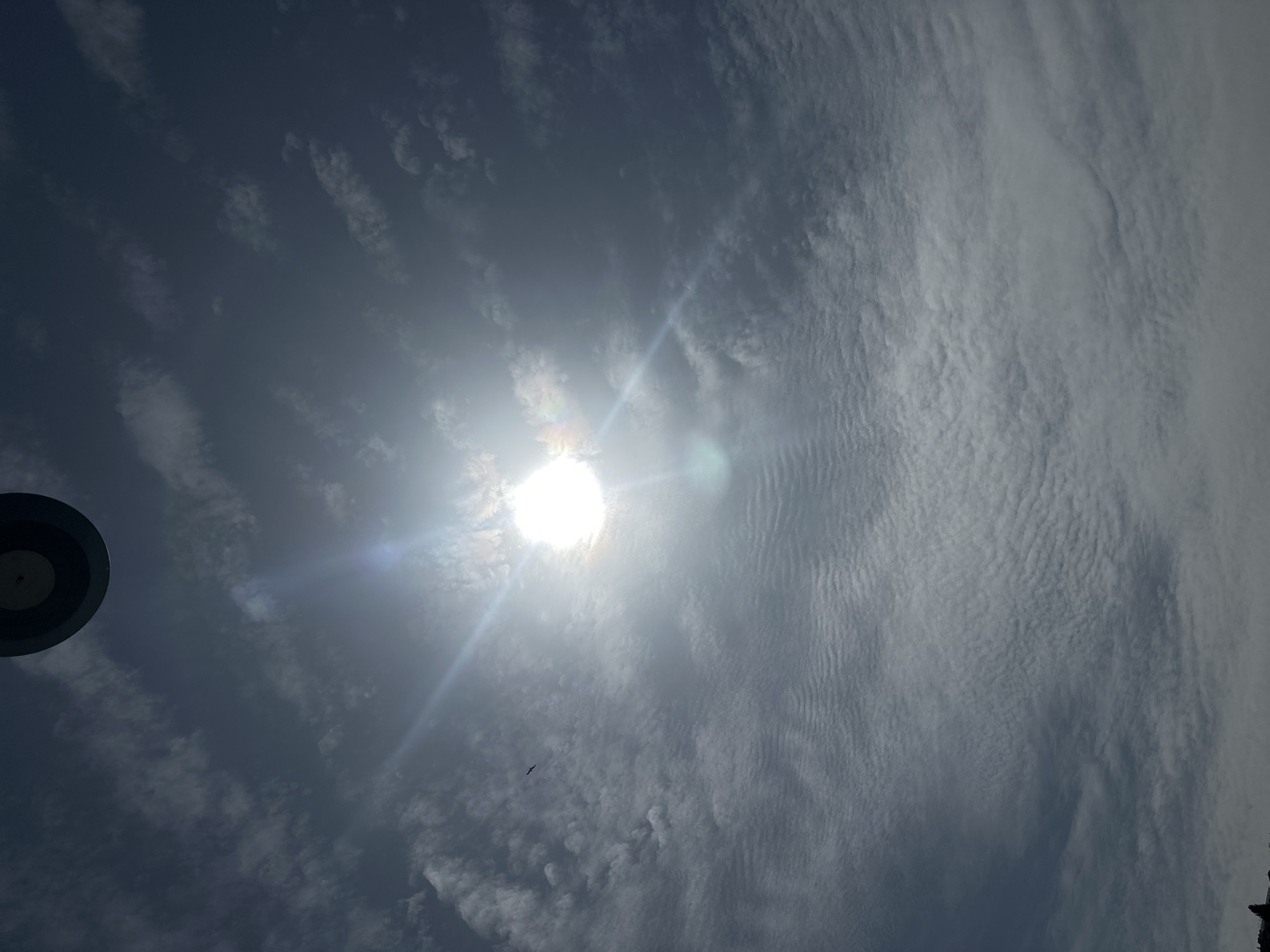The image is a low-angle shot of the sky, likely taken in Başakşehir, Turkey. The sun is prominently featured, obscured by thin clouds, causing a bright glare with visible rays of light. The sky is overcast with a variety of cloud formations, some resembling ripples. A dark, circular object is visible in the lower left corner, possibly part of a light fixture or a similar urban element. There is a small black bird in the sky below the sun.