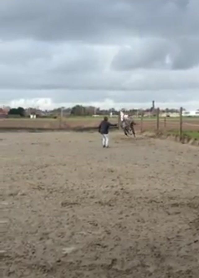 A person wearing a dark jacket and light-colored pants is in a sand arena with a white and gray horse. The person is holding a long whip or stick, and the horse is galloping around the arena. The horse is wearing a halter. There is a fence around the arena, and beyond the fence are trees, fields, and some buildings in the distance. The sky is cloudy. The person appears to be guiding the horse.