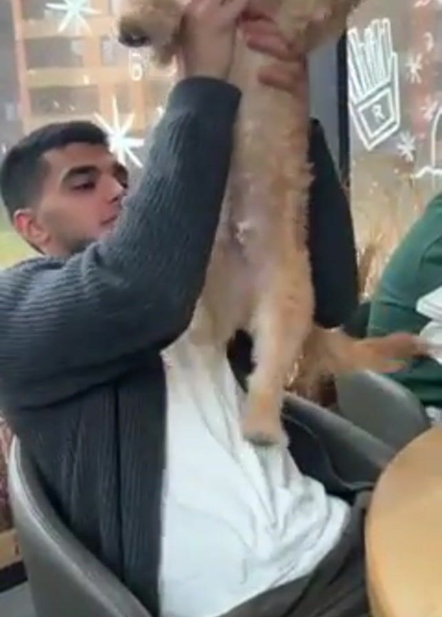 A young man sits indoors in a chair, holding a small, light-brown dog. He is wearing a gray cardigan over a white shirt. The dog is held upright, then lowered into the man's lap, where he strokes it. There's a wooden table visible and another person seated to the side, partially obscured, wearing a green long-sleeved shirt. A window behind them is decorated with white snowflake and french fries art. Outside, a building is visible.