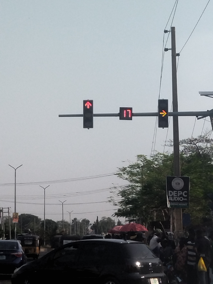 traffic light in New Karu, Nigeria. The traffic light is mounted on a pole with two other traffic lights. The left traffic light has a red arrow pointing upward, indicating that traffic in that direction is stopped. The middle traffic light is a digital countdown clock displaying the number 17. The right traffic light has a yellow arrow pointing right. The traffic light is situated on a four-lane road with cars stopped. The image appears to be taken during the day, as the sky is clear with some clouds. There are trees and power lines in the background. On the right side of the image, there are several people standing on the sidewalk, some wearing striped shirts and others with motorcycles. A sign with "DEPC AUDIO" is visible. There are some parked cars. The image shows a normal street scene with a stoplight controlling traffic.