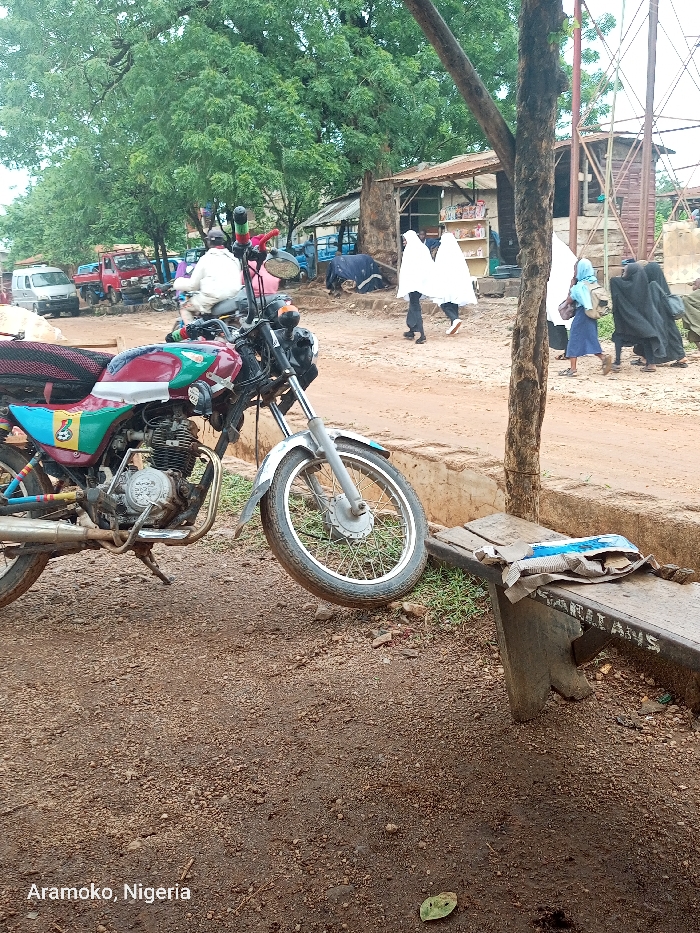 A red motorcycle with a green, white, and blue stripe is parked on a dirt road near a wooden bench with the inscription "ISANILAYS". Several people are walking in the distance, including women wearing long, white robes. The image was taken in Ilobu, Nigeria, located at 7.835 latitude and 4.479 longitude. A tree trunk and a large branch extend from the left foreground of the image into the middle ground. The road and the ground around the motorcycle and bench are covered in dirt and small rocks. The sky is overcast and there are several trees in the background. The overall scene is a typical street scene in a rural area of Nigeria.