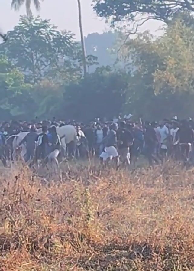 In a wide shot, a crowd of people mills in a dry, grassy field under a hazy sky. The majority of the individuals are wearing dark clothing, and their actions appear somewhat chaotic, though specific interactions are difficult to discern due to the distance. Patches of green grass are visible near the bottom of the frame. In the background, trees and a palm tree are visible. The overall image quality is slightly blurred, indicating that the camera might be handheld.