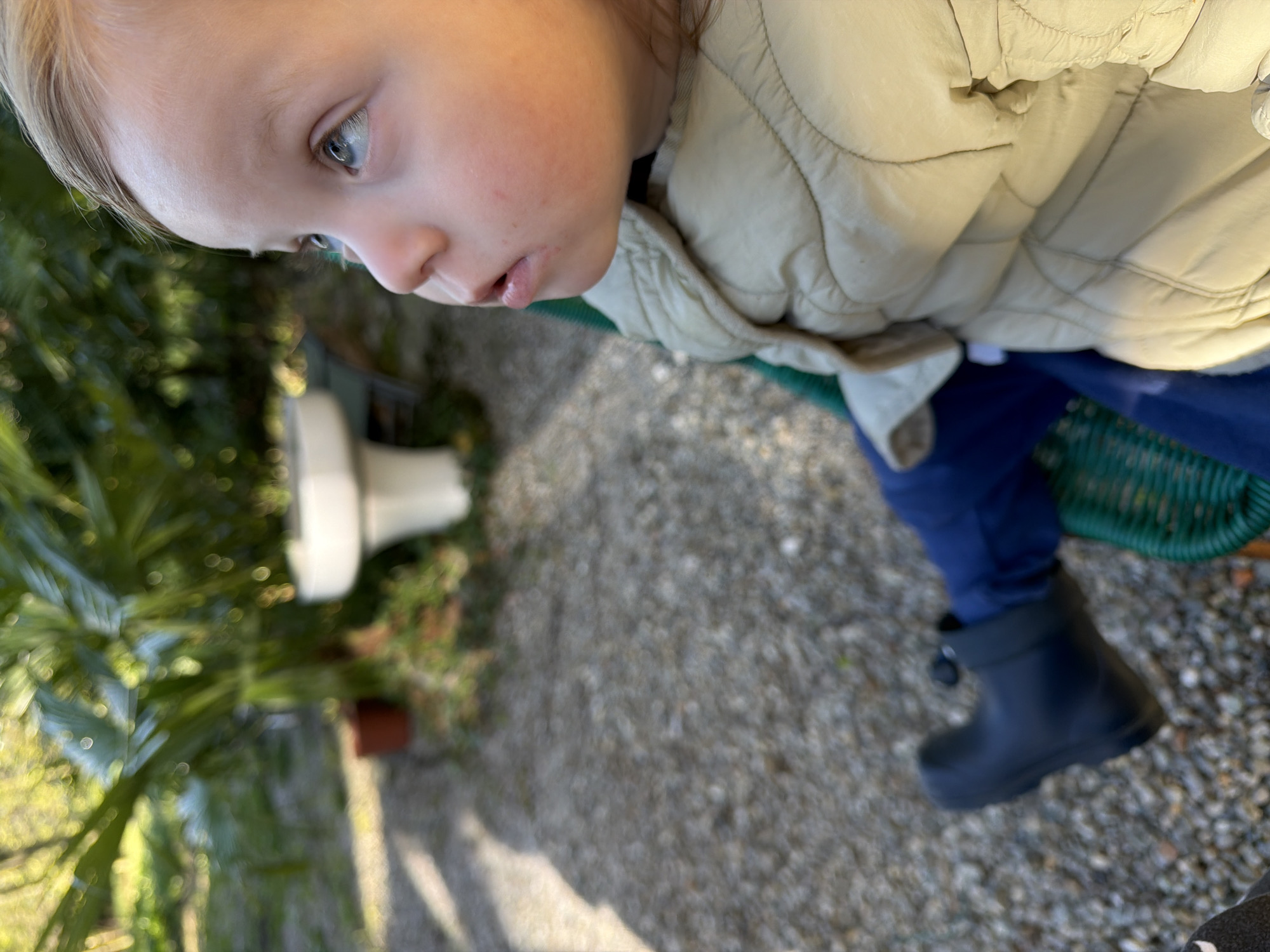 A child wearing a beige puffy jacket, blue pants, and black boots is sitting in a green wicker chair. The background appears to be a gravel-covered outdoor area, possibly a garden or yard, with greenery visible on the left side of the frame. A white object, possibly a part of a light fixture or another outdoor element, is seen among the greenery. The location is Erba, Italy.