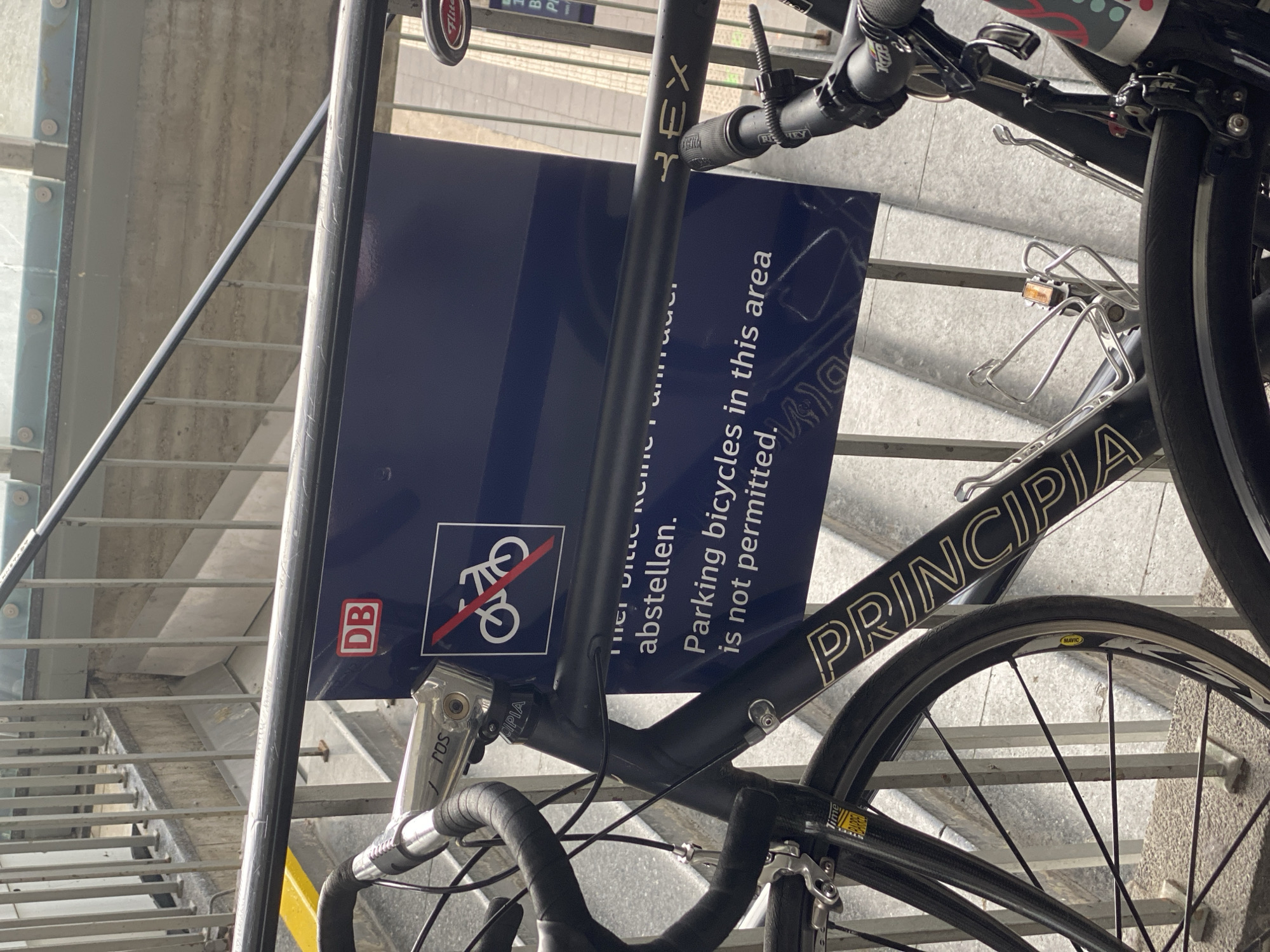 A bicycle is parked next to a Deutsche Bahn (DB) sign that reads "Parking bicycles in this area is not permitted," likely on a staircase in a public transportation area in Heidelberg, Germany. The bicycle, with "PRINCIPIA" on its frame and "REX" visible on the stem, appears to be a road bike with a Mavic wheel. The sign is mounted on a metal pole, presumably part of the staircase railing. The background shows a stairway and possibly a glass or metal structure above or beside the staircase. The angle and orientation of the image suggest it was taken from a slightly elevated position relative to the sign and the bicycle.