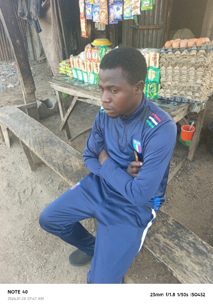 A man in a blue tracksuit with an Italian flag patch sits on a weathered wooden bench. He is next to a makeshift stall with food items, including eggs, stacked high. The stall has corrugated metal walls and a variety of snacks hanging. The area appears to be outdoors, with a dirt ground and various objects scattered around. He has his arms folded and a thoughtful expression.