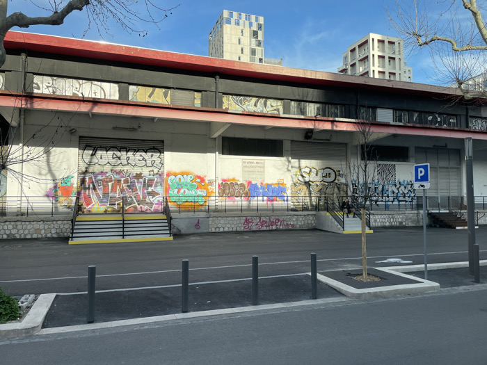 The image captures an urban scene in the Joliette / Les Docks area of Marseille, France, under a clear blue sky. A two-story commercial or industrial building forms the central subject, characterized by a red upper fascia, a dark-colored upper floor, and a white ground floor. The ground floor facade is extensively covered with multi-colored graffiti tags, including "LOCKER" and "NAVE" prominently displayed on a left-side roll-down security shutter. Other tags like "SAD" are visible on subsequent shutters to the right. Several sets of concrete steps with black railings featuring yellow horizontal stripes provide access to the building's entrances. A low stone wall with a concrete coping runs along the base of the building. In the foreground, an asphalt street with white painted markings is separated by multiple dark grey bollards from a paved area. This area includes a square, raised planter containing a small, bare-branched tree. To the right, a blue parking sign, displaying a white "P" and a motorcycle pictogram, is mounted on a grey pole. One individual, dressed in dark clothing, is seated on the concrete steps to the right of the central tree, facing away from the camera. In the background, two distinctively modern, multi-story buildings with light-colored facades and numerous balconies rise against the bright sky. Shadows from unseen trees are cast onto the left side of the main building and the foreground pavement, indicating clear, direct sunlight.
