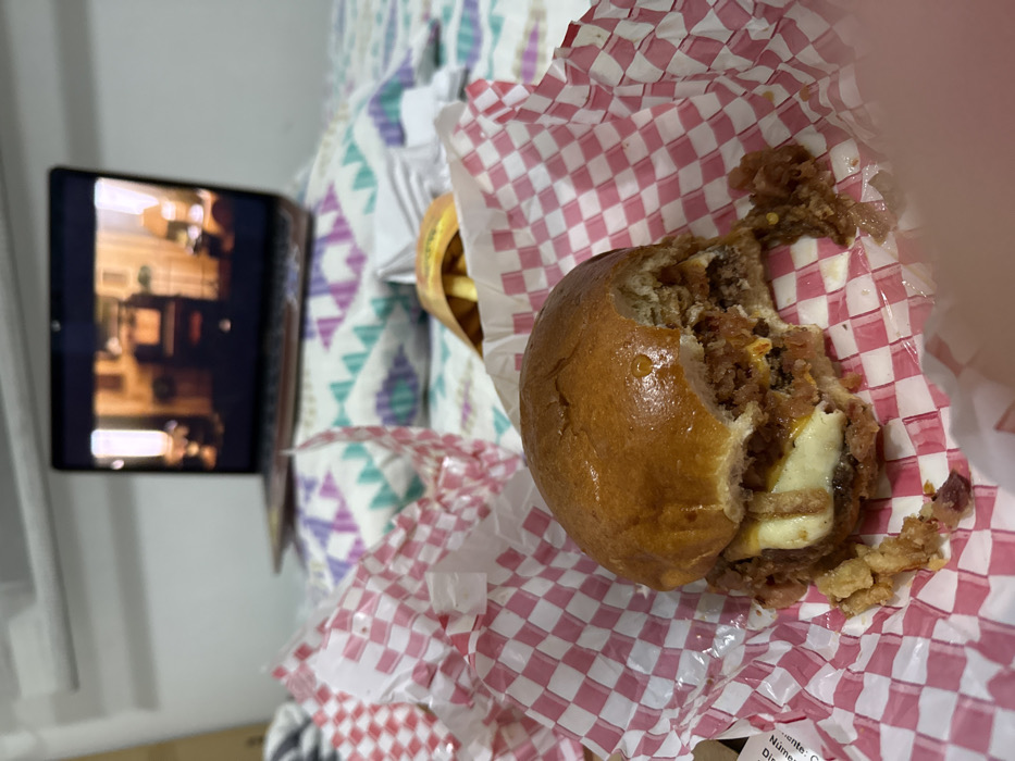 A partially eaten burger sits in a red and white checkered wrapper. The bun is shiny and golden brown, revealing cheese and meat filling where a bite has been taken. Beside it, a container of french fries is visible. In the background, a tablet displays a blurry video. The scene appears casual and relaxed, suggesting someone enjoying a meal while watching something on their device.