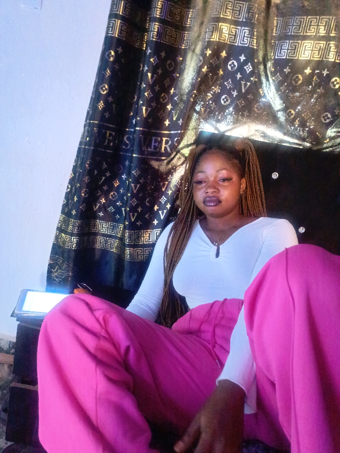 A female subject is depicted seated indoors, looking directly towards the camera. She has medium-brown skin, light brown braided hair styled into two pigtails, a nose piercing on her left nostril, and wears heavy eyeliner. Her lips are full and slightly parted. She is dressed in a white long-sleeved ribbed top with a small metal ring at the chest and bright pink wide-leg trousers. A thin necklace is visible around her neck. Her left hand rests on her lap. The subject is positioned against a dark, upholstered surface, possibly a headboard, with two circular decorative elements visible on its right side. To her left, behind her, is a dark fabric or curtain featuring a repeating pattern of gold Greek key motifs, 'LV' monograms, and partially visible text "VERSACE" or "VE SERS". Adjacent to the fabric on the left is a light-colored wall, illuminated by a bright blue-white glow from an electronic device, likely a tablet or laptop, resting on an unseen surface below it. Partially visible below the device are dark, block-like objects. The scene is an indoor environment. No specific features within the image confirm the location as Akwanga, Nigeria.