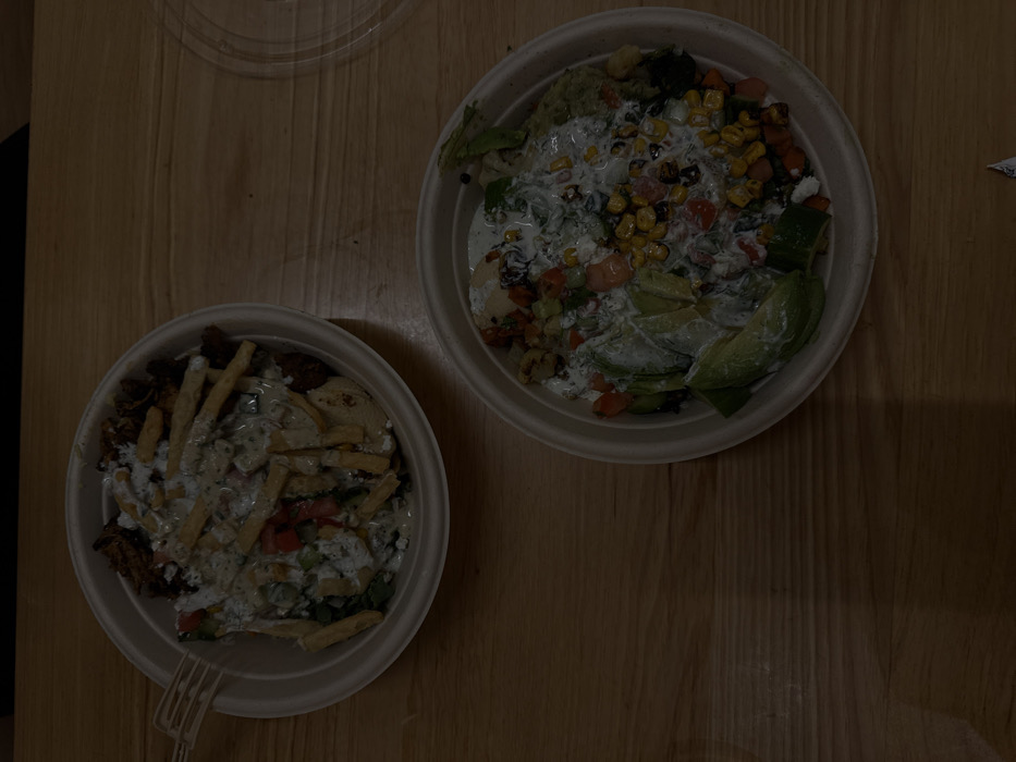 Two bowls rest on a wooden surface. One bowl contains a salad with avocado slices, corn, black beans, tomatoes, and a white creamy dressing. The other bowl features meat, crispy tortilla strips, lettuce, diced tomatoes, and a similar white dressing. A plastic fork is visible near the second bowl. The lighting is dim, creating shadows across the scene.