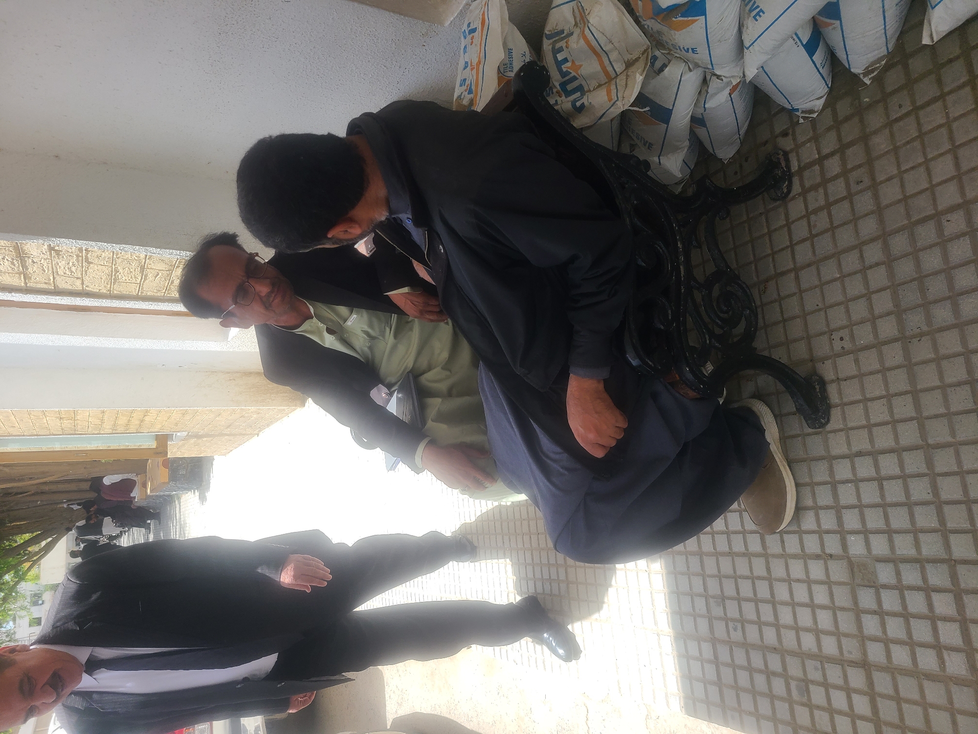 Location: Quetta City Tehsil, Pakistan. Scene: Two men in business attire are conversing outside a building. One man wears a black suit and tie, while the other wears a light green shirt with a dark blazer. The latter man appears to be gesturing with his hand. A third man partially visible in the lower left corner. Near the men is an ornate metal bench, placed adjacent to bags of what looks like adhesive. The ground is tiled. Other people are in the background along the sidewalk.
