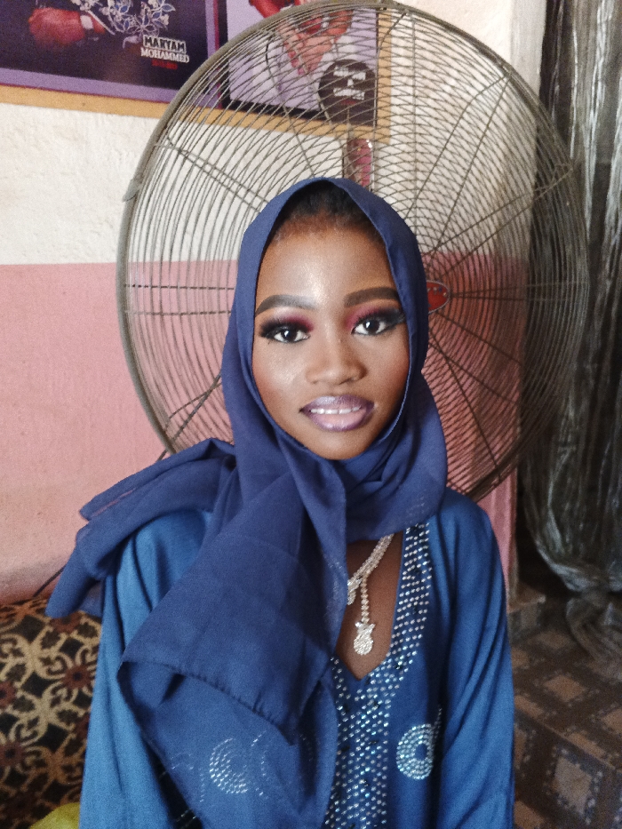 An indoor, chest-up image depicts a young Black female in Doma, Nigeria, posed for the camera
